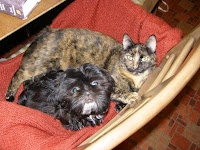 Puppy got all prettified for Valentines as well. After her bath, we were finally able to keep a ponytail in her hair, although the poor hairdryer is probably scarred for life. She barked at it to death. Isn't she adorable?! The other day she 'got some learning' laying on dd's desk while she was doing school. The only problem is she prefers to chew books and papers than learn from them. Clemie also slept for awhile with the cat in the chair. They became friends. So cute together!